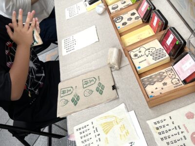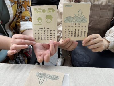 今回のワークショップでは、耳付きの手すき和紙に消しゴムはんこを押して、オリジナルカレンダーをつくる体験を提供しました。参加者は、あらかじめ月日が押された和紙の中から好きな月を選び、東北の名物をモチーフにした12種類の絵柄はんこの中から好みのものを選んで仕上げていきます。